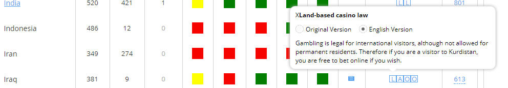 Судя по существующей на сегодня информации на Keytocasino, в отношении наземных казино, Ирак относится к странам "Legal in limited localities only" То есть согласно данным сведениям, наземные казино не запрещены полностью, а могут функционировать в ограниченных, специально отведенных для этого зонах.
