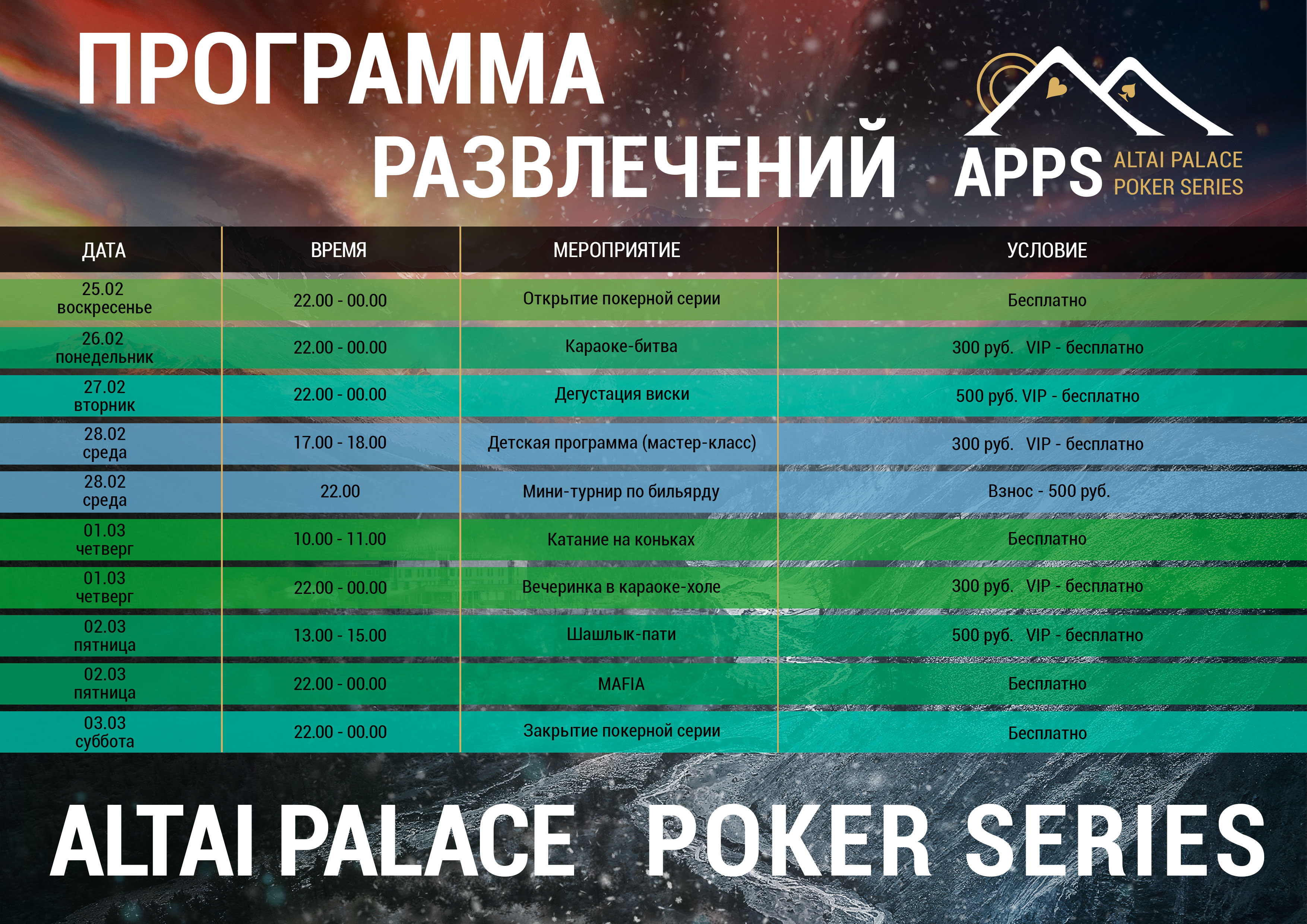 Помимо участия в турнирах и кеш-игры, участники APPS смогут отлично отдохнуть в Алтае. Их ждут развлечения и оздоровительные процедуры.