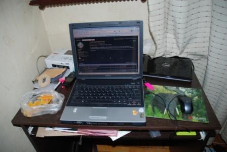 Мой рабочий столик. Все что нужно - рядом! Ноут, второй на всякий случай, принтер для печати фото, сотовый телефон, ну и закуска конечно (на фото сушеное манго). В выдвижной полке бумажки-документы. Мусор, кожуру от бананов и яблок можно складывать за ноутбук, так его не видно :)