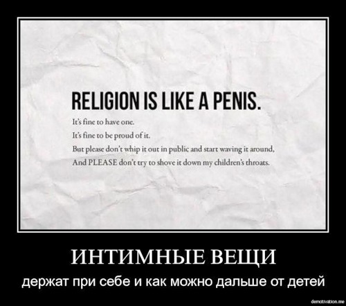 Но над нашим сознанием уже надругалась религия. У каждого из нас своя история, но все мы сорвали эти оковы. И теперь наша задача – спасать будущее поколение от этой напасти. Не навязывать атеизм, нет. Наша задача взрастить их так, чтобы их сознание было чистым от этой гадости, дать им возможность узреть красоту и элегантность науки, а затем, если вдруг они пожелают – пусть крестятся, пусть обрезают свою крайнюю плоть, пусть танцуют голышом вокруг пентакла, выведенного кровью убиенной овцы, что угодно. Это их право, ведь они свободны. Остаться идиотом – это священное право каждого человека, и лично я уважаю каждого идиота, который не желает иметь ничего общего со своим разумом. Мы не должны повторять ошибок религий, навязывая атеизм потомкам, мы должны оставлять выбор. Уверен, большинство никогда не поверит в христианские, мусульманские или индусские сказки. Держите мозг детей в чистоте, оставляйте их открытыми к новой информации всегда – это залог интеллектуальной эволюции. И только так возможна настоящая свобода, какая только возможна для живого человека. Спасибо за внимание.