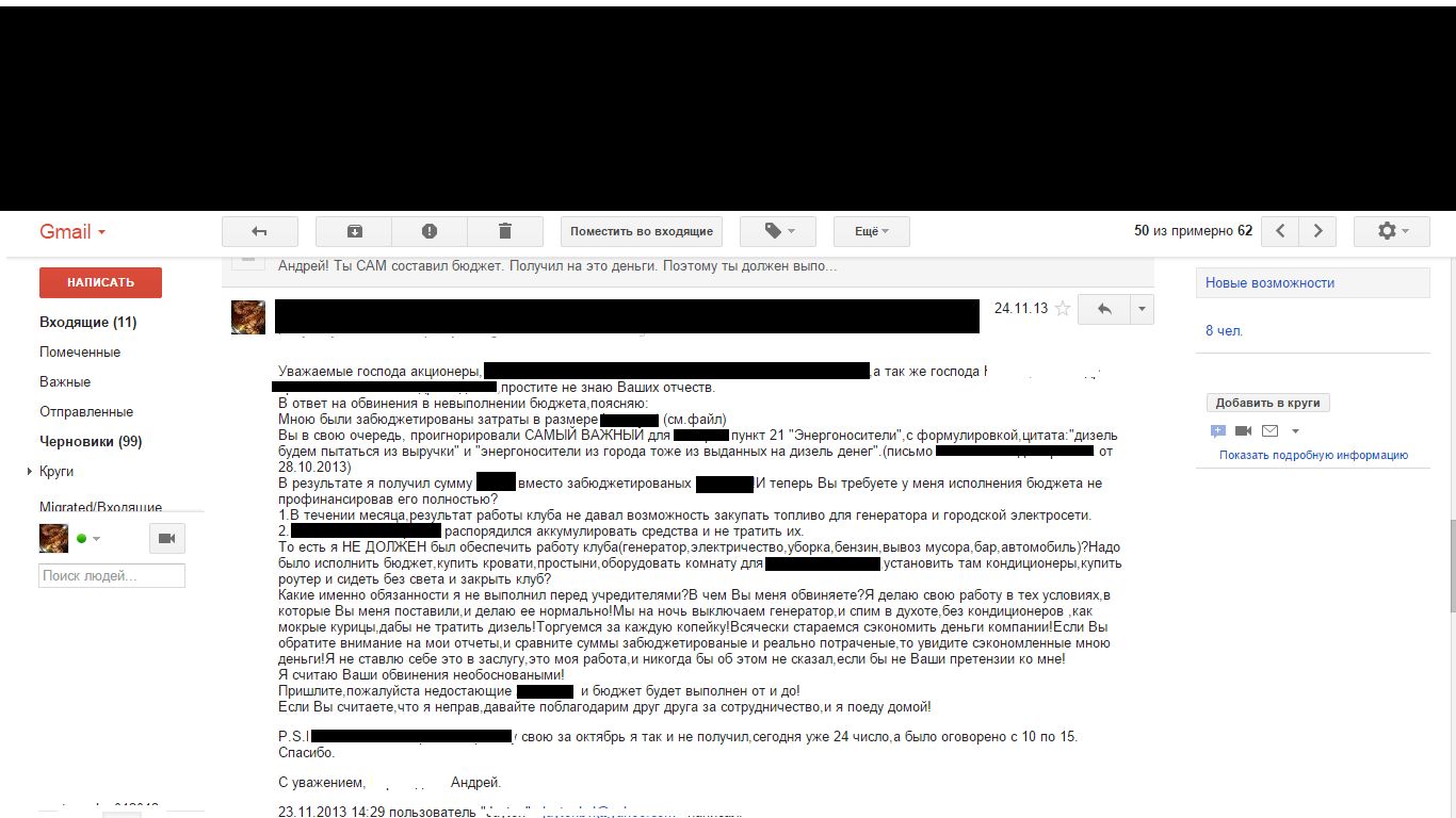 Ты свое мнение излагаешь в письмах. Большинство из того, что ты написал не соответствует действительности. Например: ЛИЦЕНЗИЯ .Во всем разобрались. Лицензию нам подтвердили. Платежки все нашлись. И в компенсацию за причиненные неудобства продлят лицензию на год за половину стоимости. ( а ты только показал свою нелояльность во всем поверив местным полицейским, а не твоим работодателям)))))