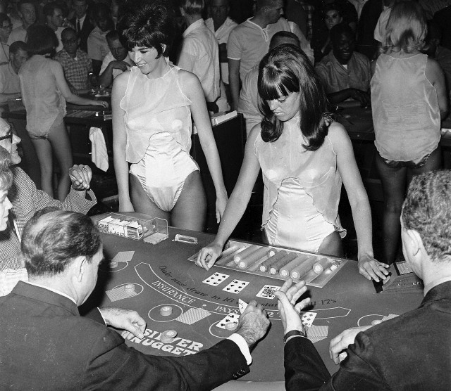 4/16/1966-Las Vegas,NV- Black Jack dealers Dianne mcmillin (l) and Jaye Boack work in the pit at the Silver Nugget Casino 4/16 wearing costumes with see-through tops. The management brought the girls on the 1 to 8 AM shift, contending they were not topless (they had on chiffon transparent tops with pasties underneath) and therefore should not cause objections from the gaming commission or the Attorney General who earlier said, he would go to court to get an injunction against them. The women are shown dealing to a table of players.