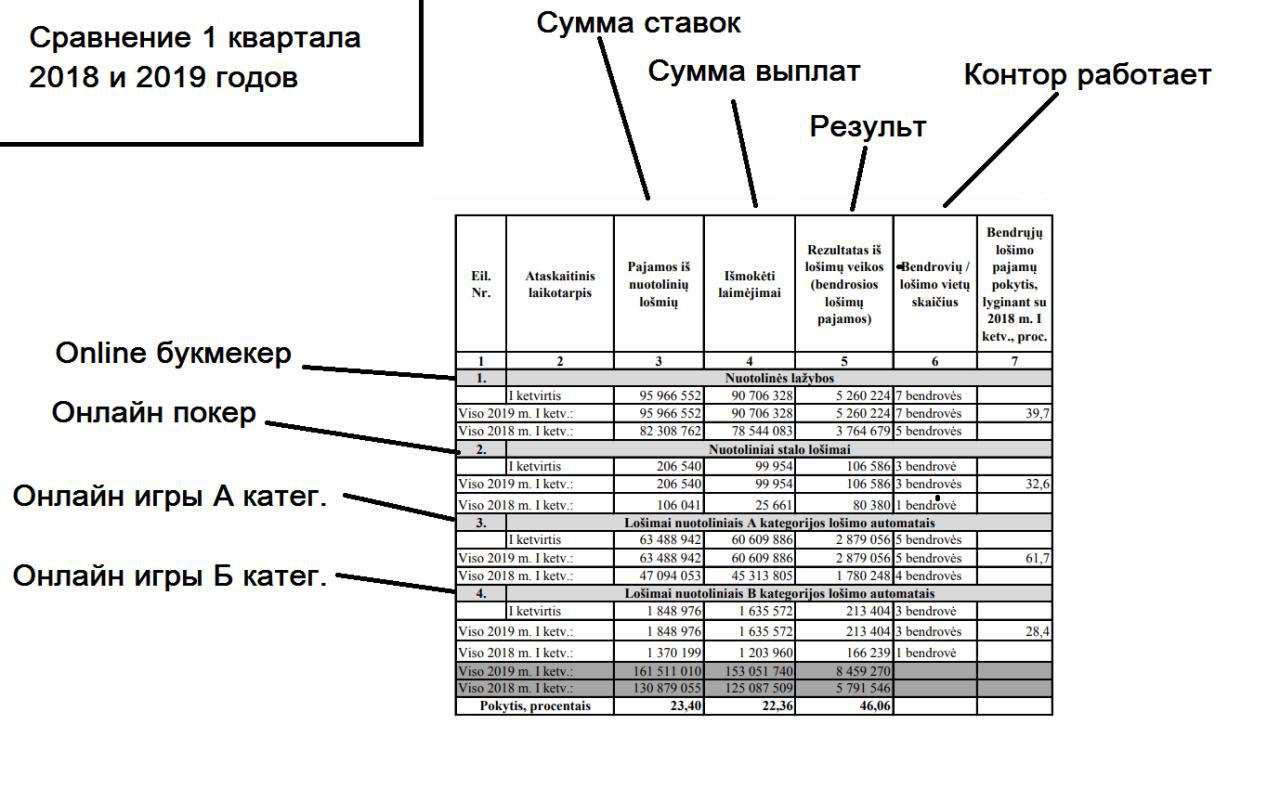 За 1-ый квартал 2019 года в Литве по сравнению с тем же периодом в 2018 году различные интерактивные азартные развлечения привлекают все больше гостей и ставок. Так официальная статистика говорит, что на игровые автоматы повысился спрос на 61,7%, на другие игры типа life games (с живыми крупье) - на 28,4%. В среднем же рост рынка в Прибалтике составляет около 30% (речь идет о легальном онлайн-бизнесе).