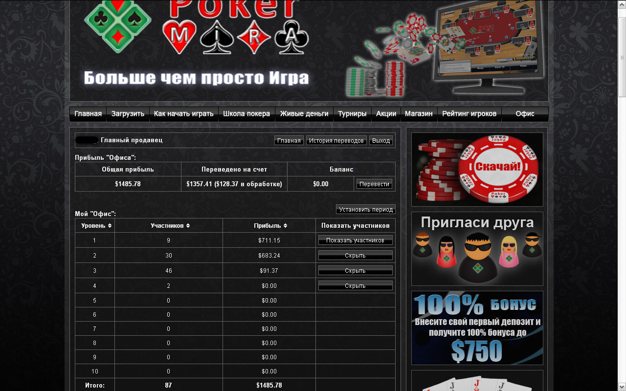 Очень важный момент-проэкт "Офис"http://www.pokermira.com/index.php?page=office_opisanie. Это второй корысный нюанс, по которому я пишу этот пост. Это по сути маркетинговая сетка. Тебя пригласили, ты пригласил... Но если ты пригласил 7 человек и больше, рум отдаёт 25 процентов их рейка тебе, с тех, кого они пригласят-12.5 проц. И так до десятого уровня. С каждого следующего уровня-в два раза меньше. К примеру, я за два месяца игры сделал 2000 дол рейка, человек, пригласивший меня получил 500 долларов на ровном месте, не приложив никаких усилий. А тот, кто пригласил его, получил 250, тоже не плохо. И со всех, кого приглашу я , они тоже получат доляху. Это выгодно, очень. Но найти людей, желающих играть, как правило очень не просто, на дороге таких не встретишь. А вот нам, работникам ИБ, проще, у нас все коллеги и клиенты шпилевые, и круг общения соответствующий. На этом можно сделать деньги.