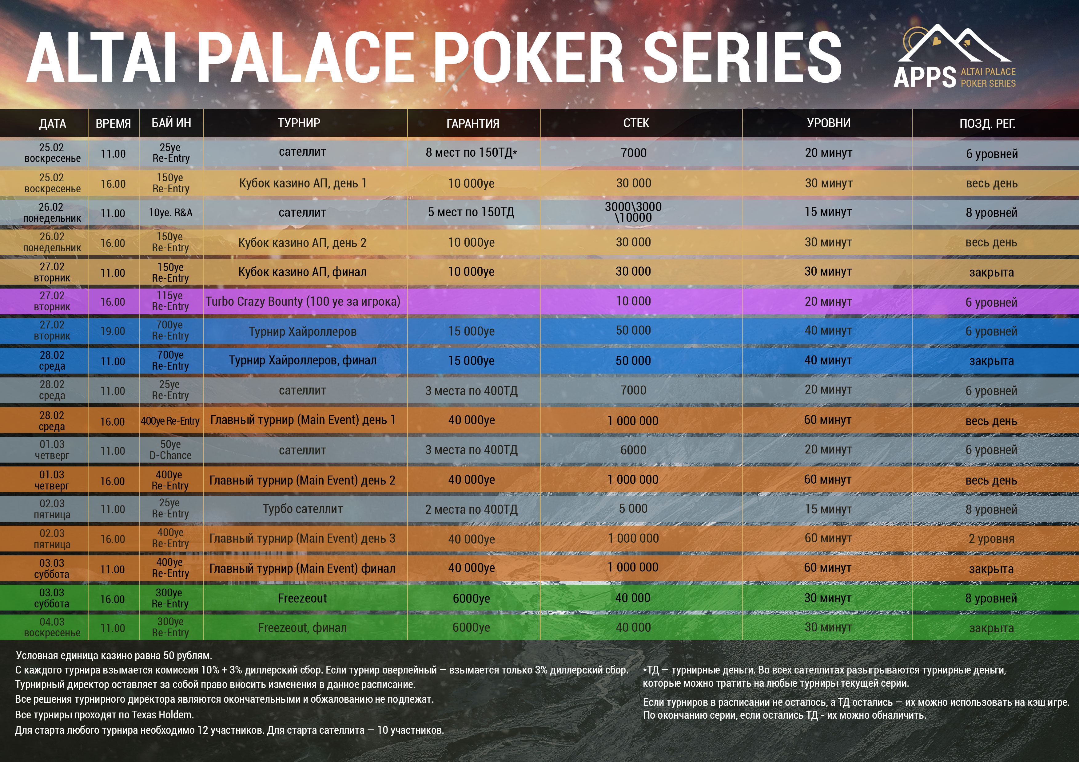 Единственное казино игорной зоны “Сибирская Монета” с 25 февраля по 4 марта проведет второй чемпионат по покеру Altai Palace Poker Series (APPS). Ожидается, что в ней примет участие порядка 200-300 человек. В основном из Барнаула, Новосибирска, Кемерово и Красноярска. Ожидаются игроки из Москвы.